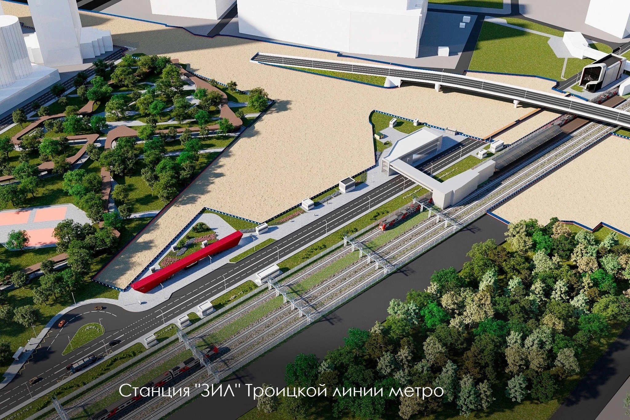 Станционный комплекс «ЗИЛ» Троицкой линии метро строится у пересечения проспекта Лихачева с улицей Лисицкого, рядом с парком «Тюфелева роща» и одноименной платформой Московского центрального кольца (МЦК). Станция будет конечной для строящейся линии метро со стороны исторического центра города. Фото «Мосинжпроект»