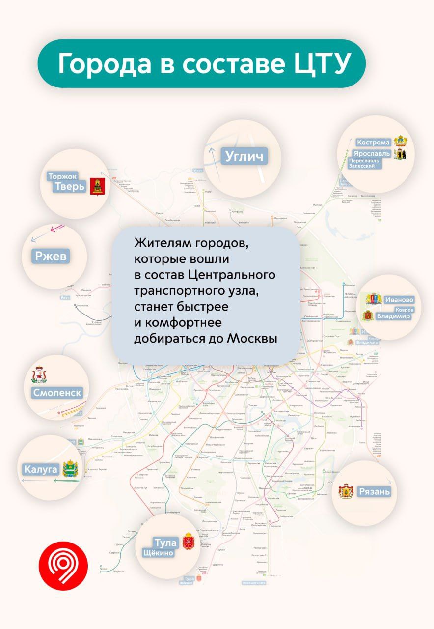 - Обозначены города, которые входят в состав Центрального транспортного узла: Калугу, Тверь, Владимир и другие.