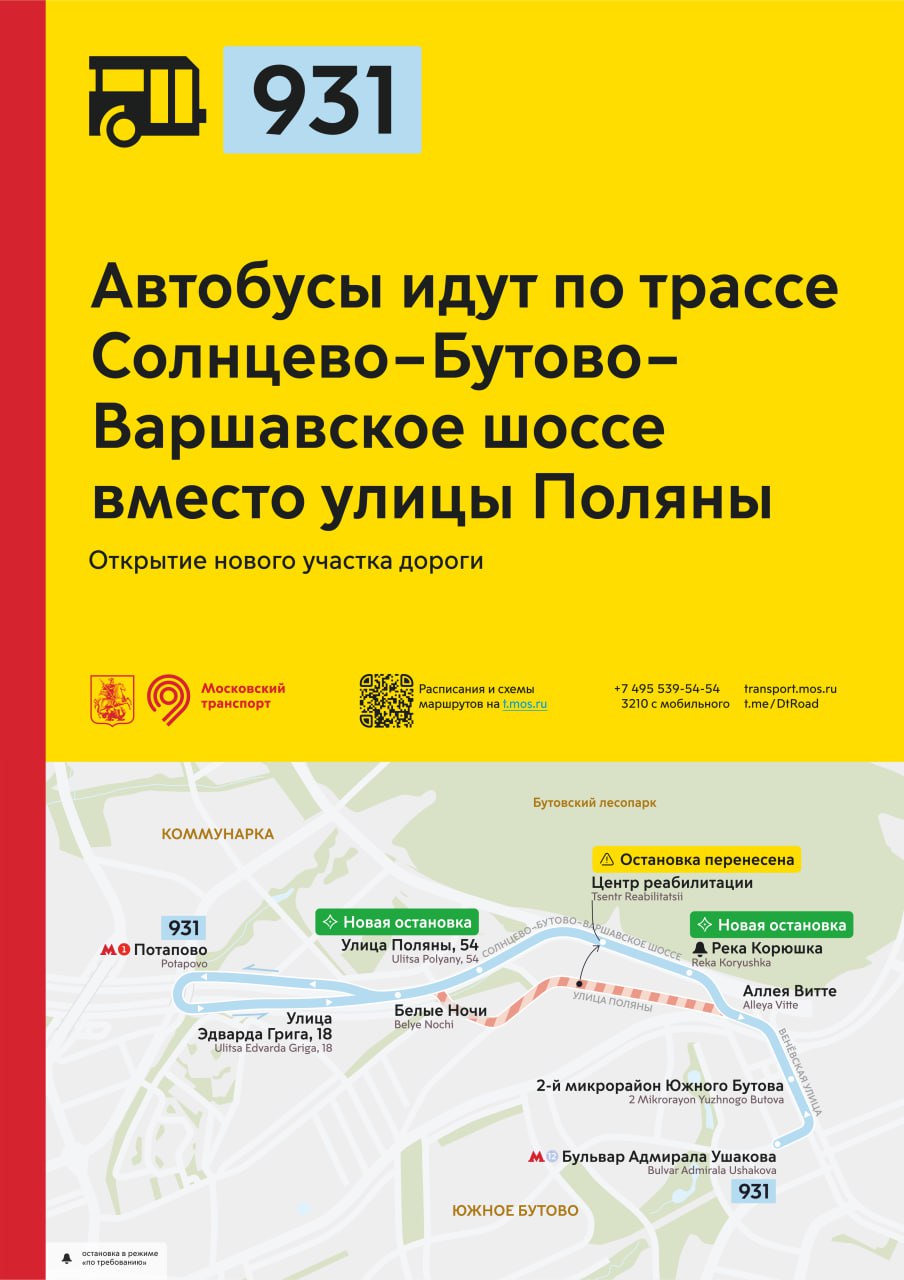 Обновление 15:35: Автобусы 931 теперь идут по трассе Солнцево-Бутово-Варшавское шоссе вместо улицы Поляны.