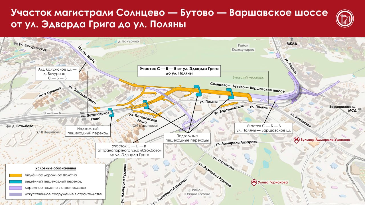 - Возведены съезды с основного хода магистрали Солнцево — Бутово — Варшавское шоссе на улицы Поляны и Эдварда Грига.