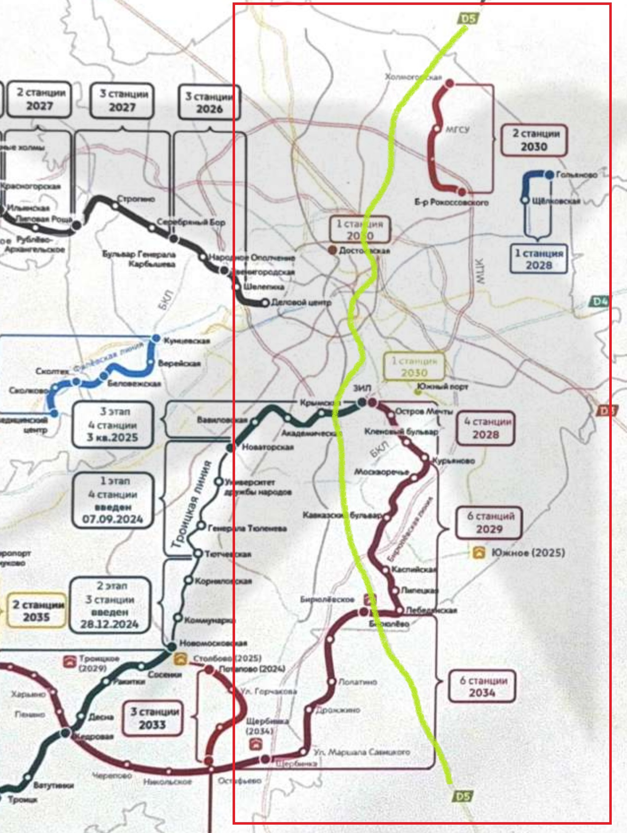 Начать можно с того, что на схеме развития Московского метрополитена еле-еле заметен полноценный пятый диаметр(МЦД-5), но про него в своем интервью мэр Собянин ничего не сказал.