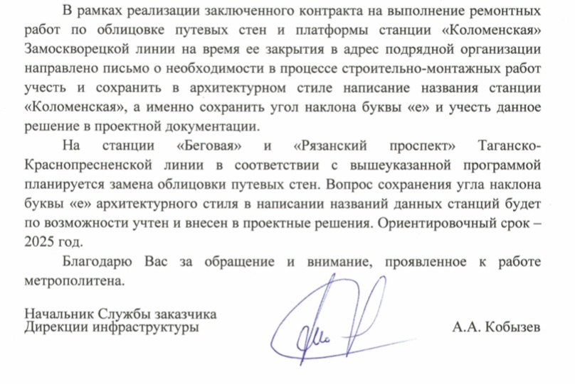 В настоящее время в рамках авторского надзора вносятся изменения в рабочую и проектную документацию, после чего производителем работ будет изменен наклон укладки буквы "е" в названии станции.