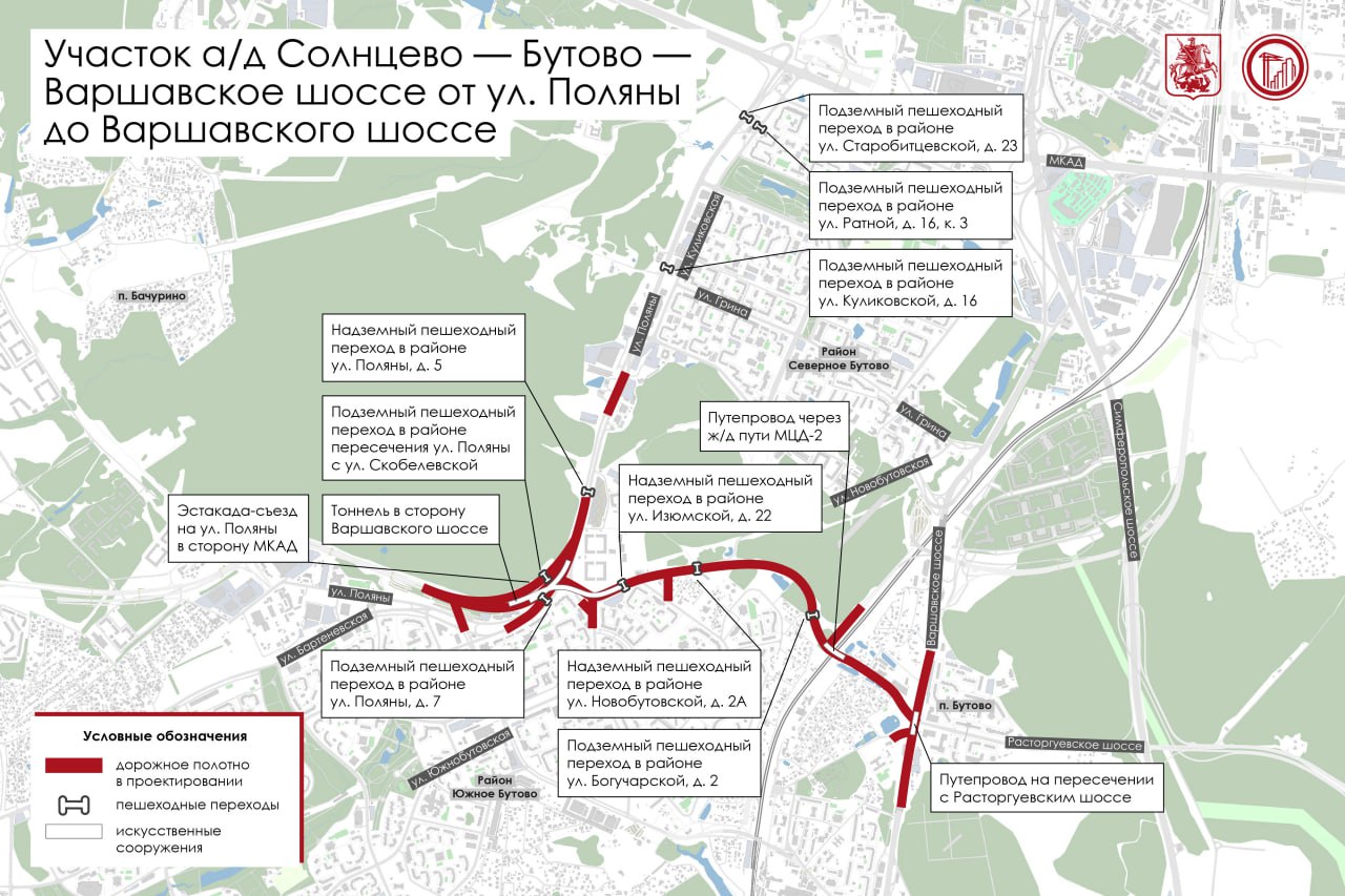 Подрядчики продолжают строить финальный участок от улицы Поляны до Варшавского шоссе: планируется положить и отремонтировать больше 14 км дорог, включая тоннель, эстакаду-съезд и два путепровода, в том числе через пути МЦД-2.