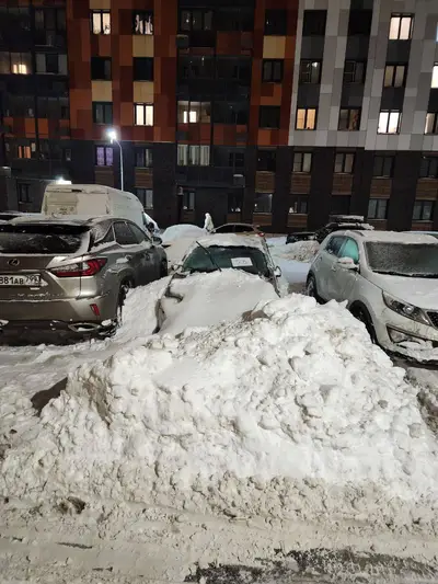 В районе Троицк, в жилом комплексе «Кленовые аллеи», как и везде в Москве, занесло машины снегом.