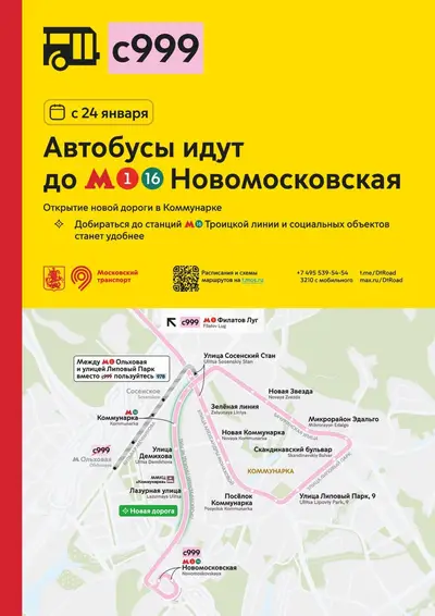 С субботы, с 24 января, по открывшемуся участку Коммунарского шоссе начнут ходить автобусы с 999 — "Филатов Луг" - Коммунарка.
