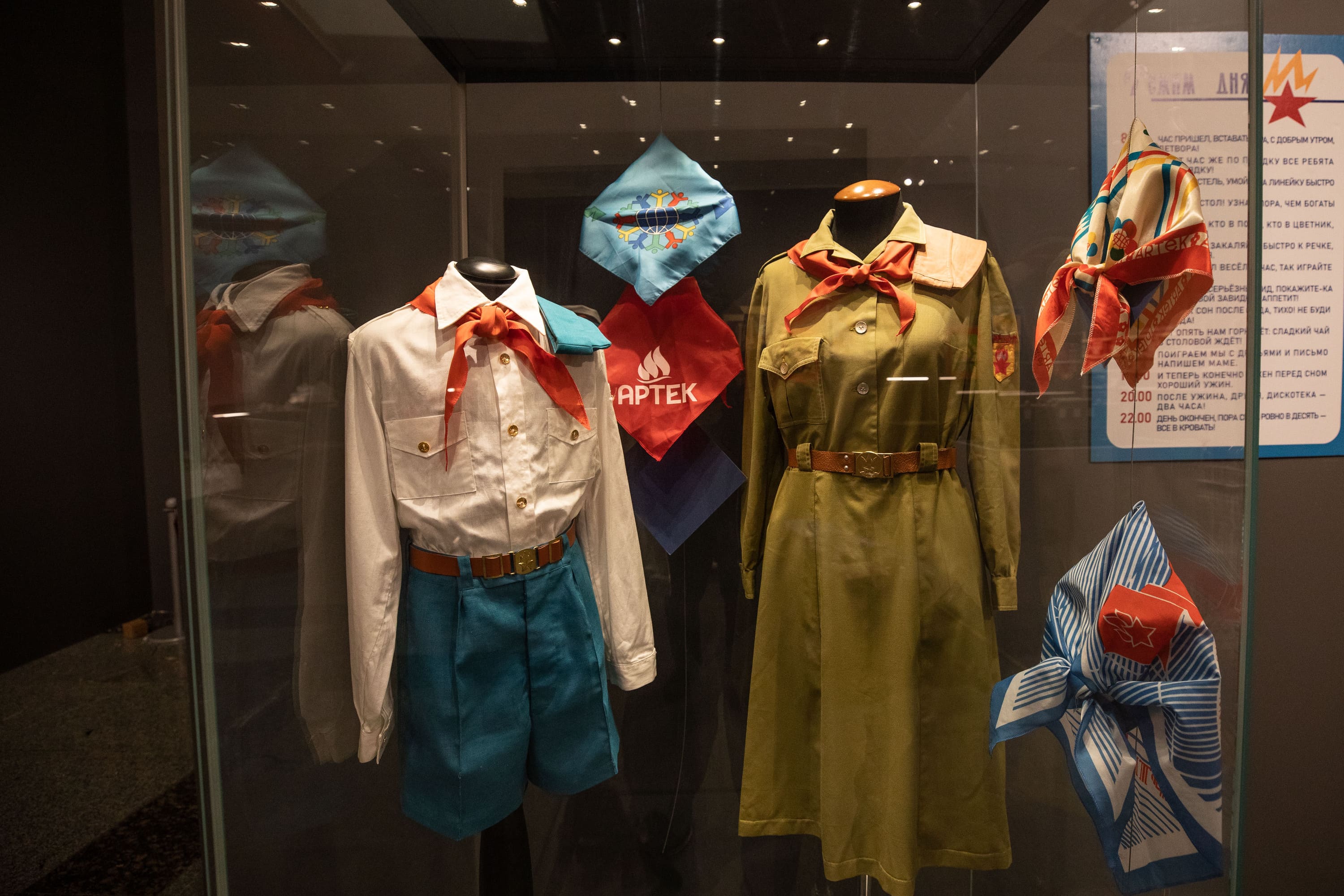 В центральной витрине будут представлены экспонаты-символы пионерского «Артека»: красное знамя первых лет «Клянемся выполнять заветы Ильича», форма артековцев и вожатых советского периода, пионерский горн и барабан – неотъемлемые атрибуты пионерской жизни страны детства.