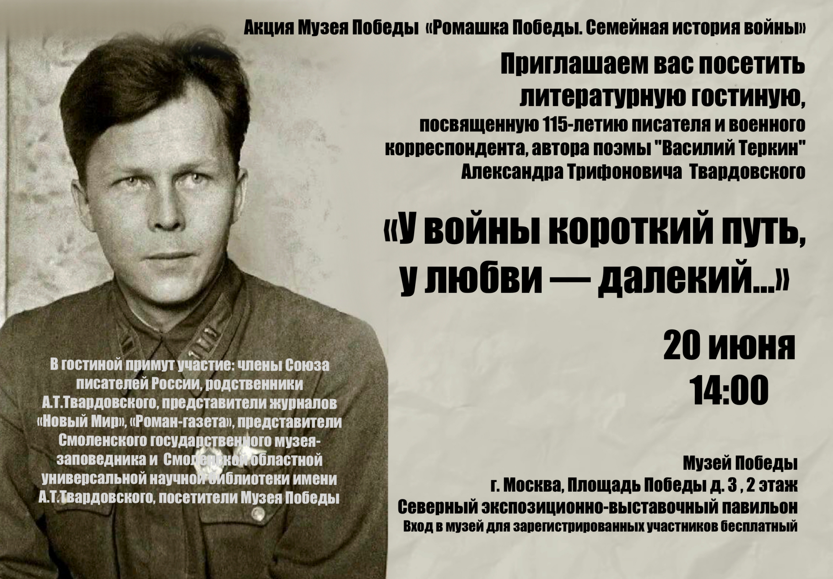 20 июня в Музее Победы пройдет Литературная гостиная «У войны короткий путь, у любви — далекий...» к 115-летию советского писателя, журналиста, военного корреспондента, прошедшего всю Великую Отечественную войну Александра Твардовского. Встреча пройдет в рамках традиционной акции музея на Поклонной горе «Ромашка Победы. Семейная история войны». (ссылка на регистрацию: https://muzey-pobedy-02.timepad.ru/event/3408973/)