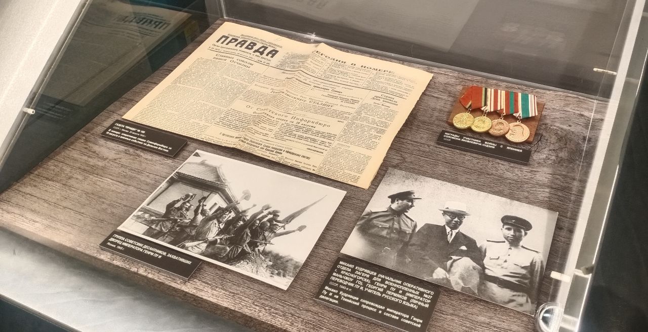 «Чтобы ускорить пленение Квантунской армии,18 августа в Харбине, 19 августа в Гирине, Чанчуне, Мукдене были высажены воздушные десанты. Дворец и бывший император Маньчжоу-Го Генри Пу И были взяты советскими десантниками. Во временной экспозиции представлена фотография группы советских десантников, захвативших дворец императора»,