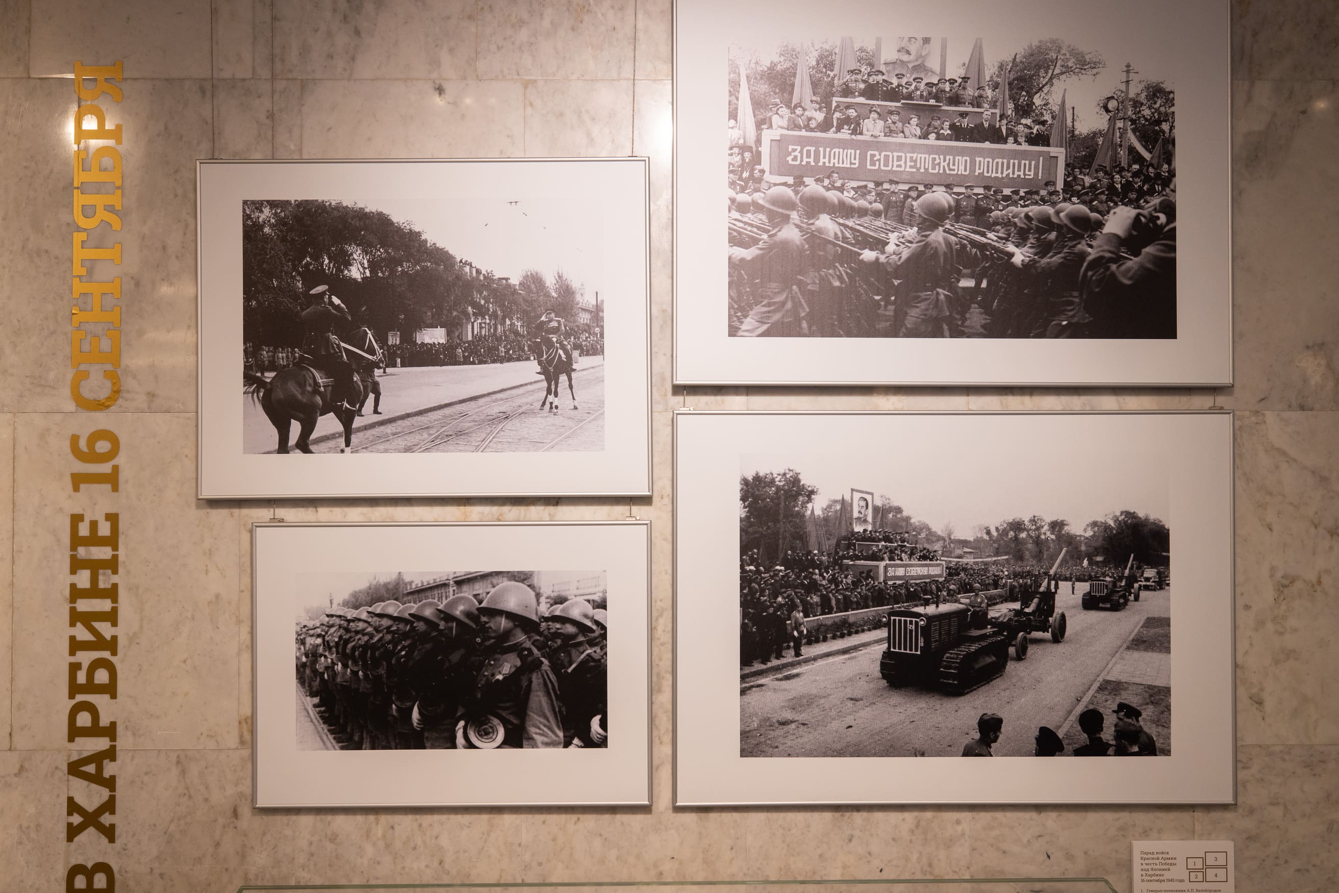 Экспозицию посвятили четырем парадам судьбоносного 1945 года, которые олицетворяли триумф армии-победительницы. Эти праздничные шествия, которые прошли в Москве, Берлине и Харбине, стали символическими точками в самой беспощадной и кровопролитной войне в истории человечества.