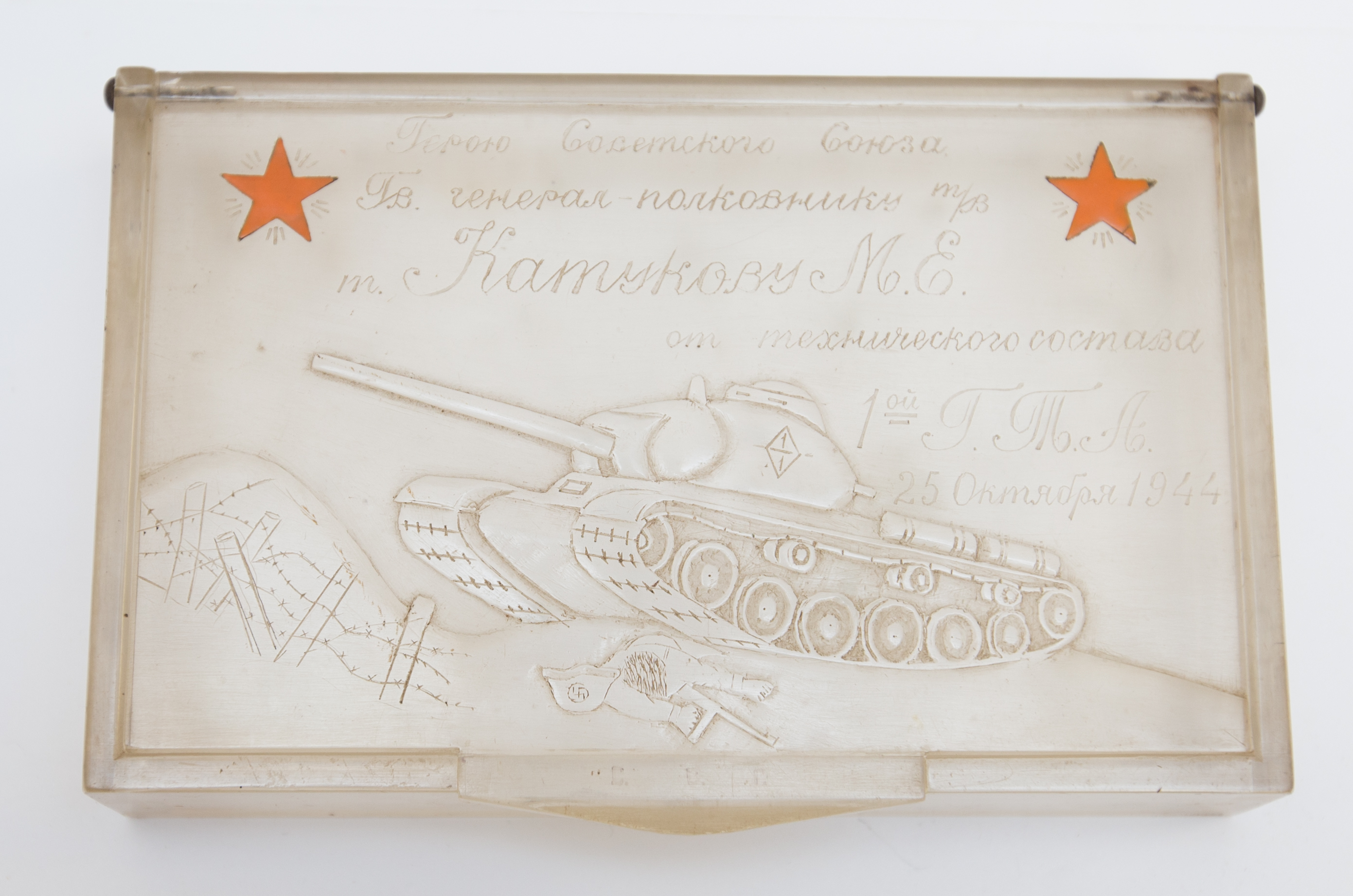 В выставку войдут 20 подлинных раритетов из фондов музея на Поклонной горе. Эти реликвии были переданы в музей потомками прославленного танкового военачальника. Среди экспонатов – документы, военная форма, награды. Например, грамоты Президиума Верховного Совета СССР о присвоении Катукову звания Героя Советского Союза, письмо от короля Великобритании Георга IV, самодельный резной портсигар, знак отличия «Маршальская звезда». Экспозицию дополнят архивные документы и фотографии.
