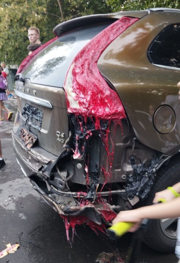 Обновление 18:58: Фотографии парочки пострадавших автомобилей от Людмилы. По данным МЭШ, один из подростков гулявших в этом месте баловался со спичками.