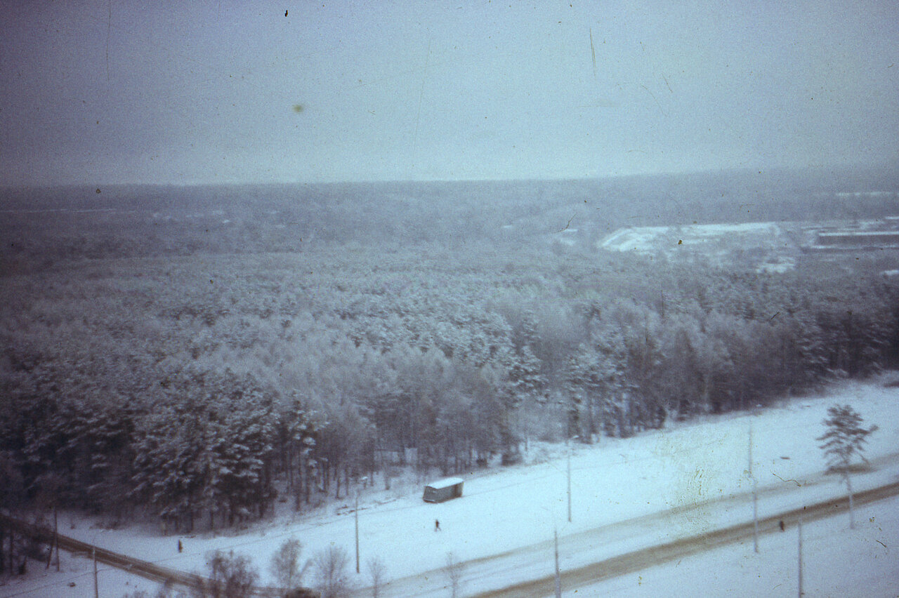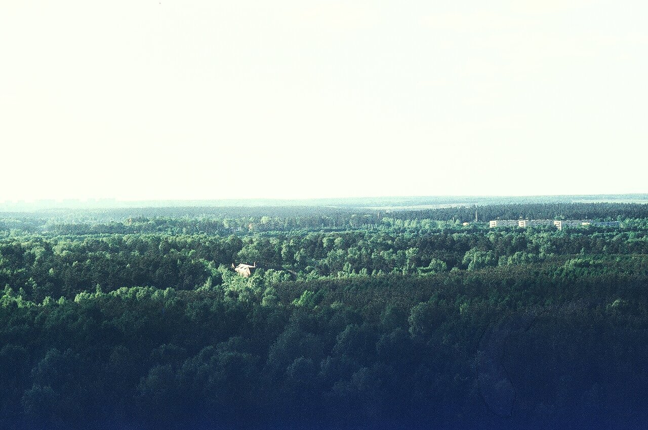 Приближенный снимок на зеленые просторы с балкона. Виднеется купол церкви, но это не точно, и скорее всего, одна из ул. Лазенки. Дома в лесу давно уже нет.