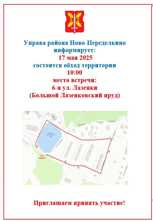 Начало маршрута: 10:00. А место встречи: 6-я ул. Лазенки (Большой Лазенковский пруд). У всех желающих будет возможность задать интересующие вопросы и обсудить важные темы.