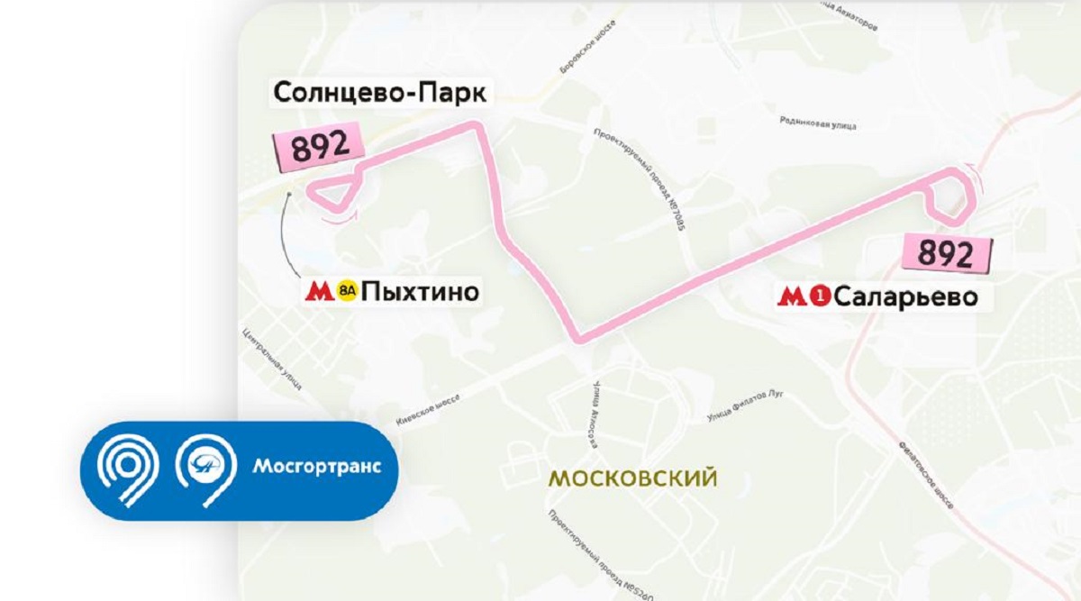 Из Внуково в Филимонковский на электробусном маршруте 892. Автобусы будут ходить от метро «Саларьево» до мкр. Солнцево Парк.