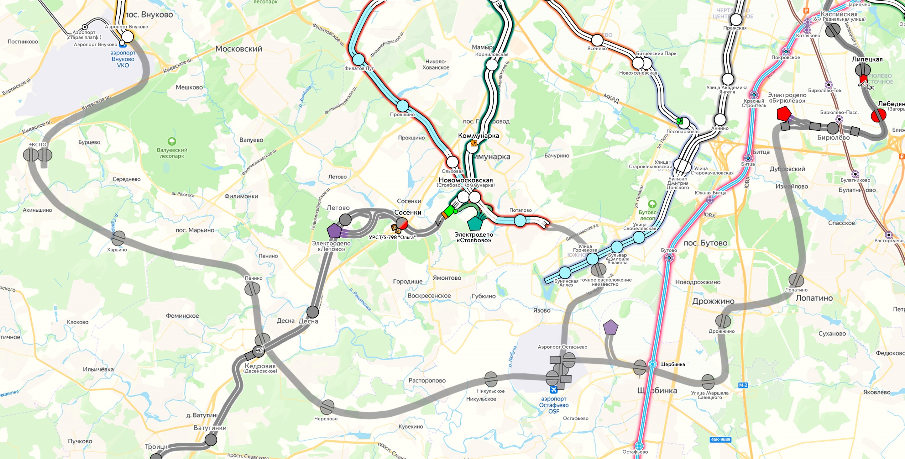 Ранее предполагалось, что конечная станция будет находиться в непосредственной близости от 🚈МЦД D2 «Щербинка», однако теперь стало известно, что окончание линии запланировано в районе ликвидируемого аэропорта Остафьево.
