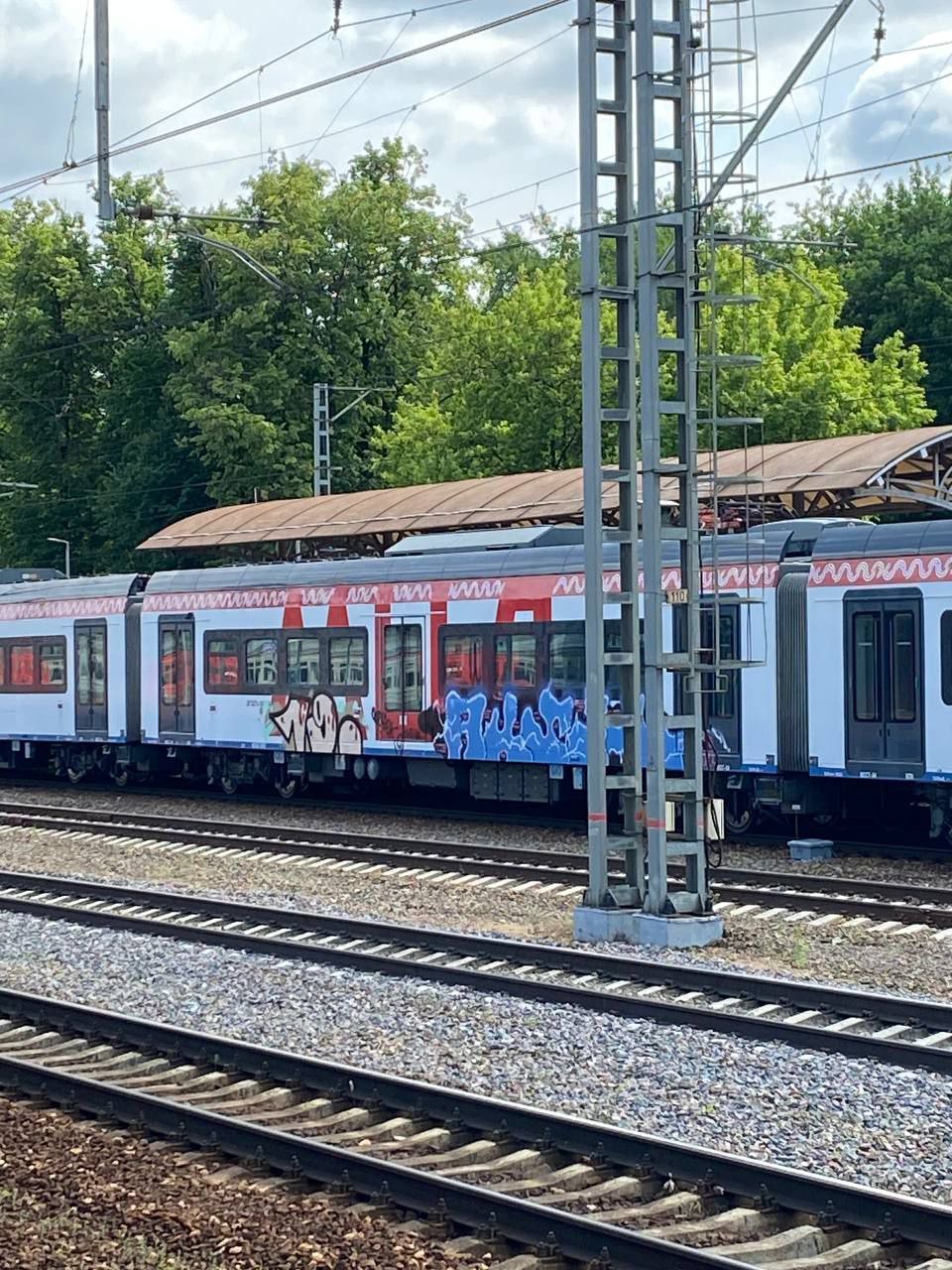 А в том, что поезд не проходил и недели, как его изрисовали странными надписями вандалы-графисты. Где это было сделано неизвестно, а снимок на станции Солнечная.