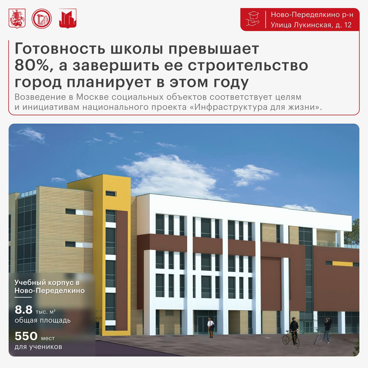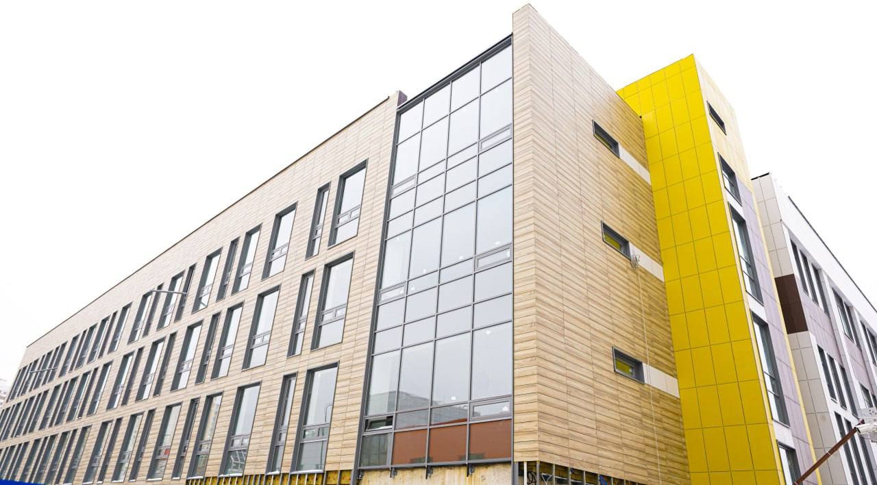 «Общая площадь школы составит 8,8 тысячи квадратных метров. Сейчас на объекте завершаются работы по монтажу фасадов, устройству наружных и внутренних инженерных сетей, чистовая отделка выполнена более чем наполовину. На прилегающей территории проведут комплексное благоустройство и сделают площадки для мероприятий, отдыха и занятий спортом. Готовность школы превышает 80 процентов, завершить ее строительство город планирует в этом году».