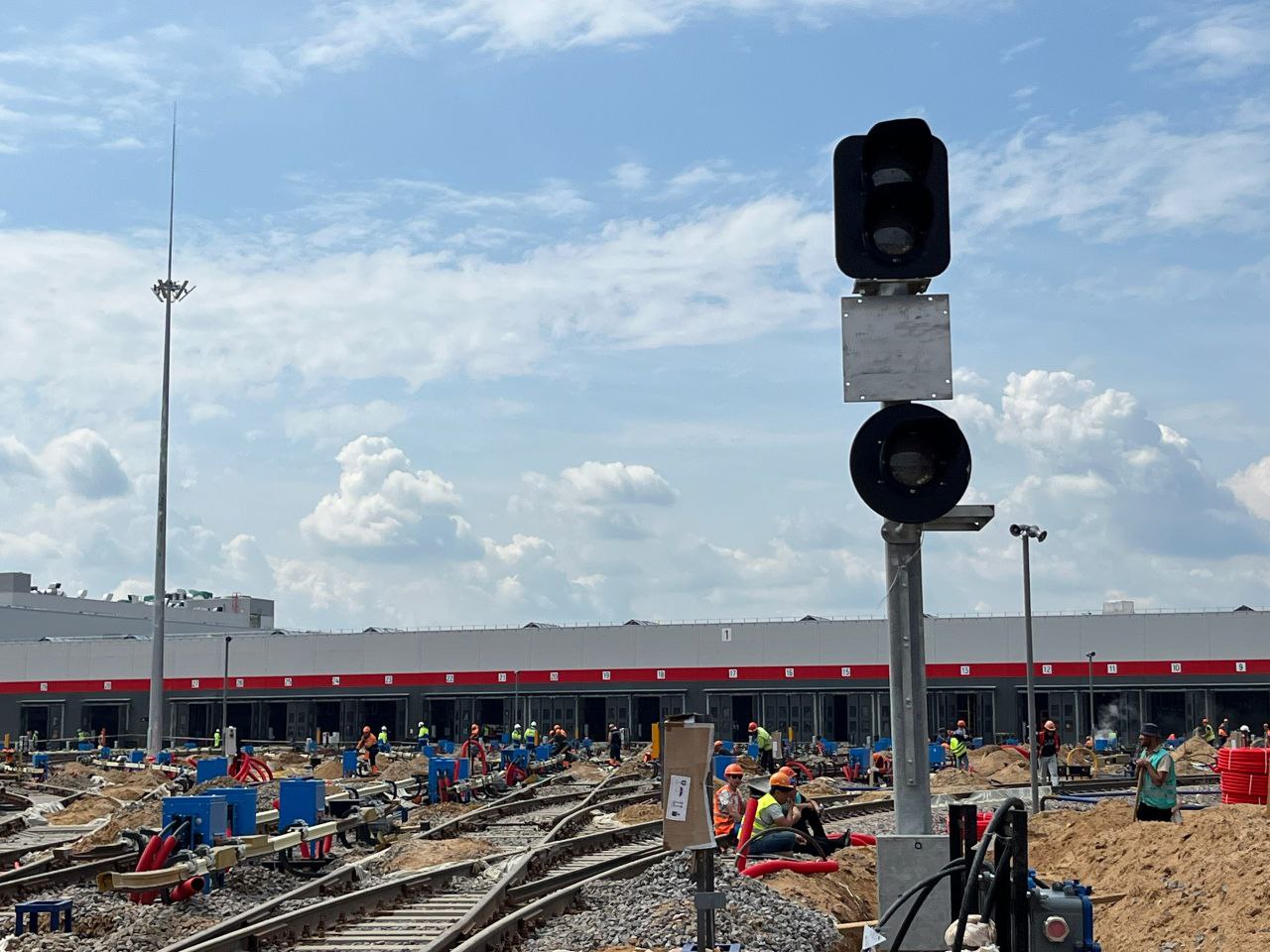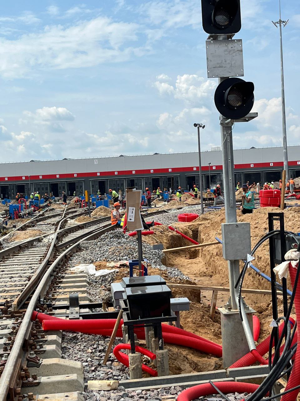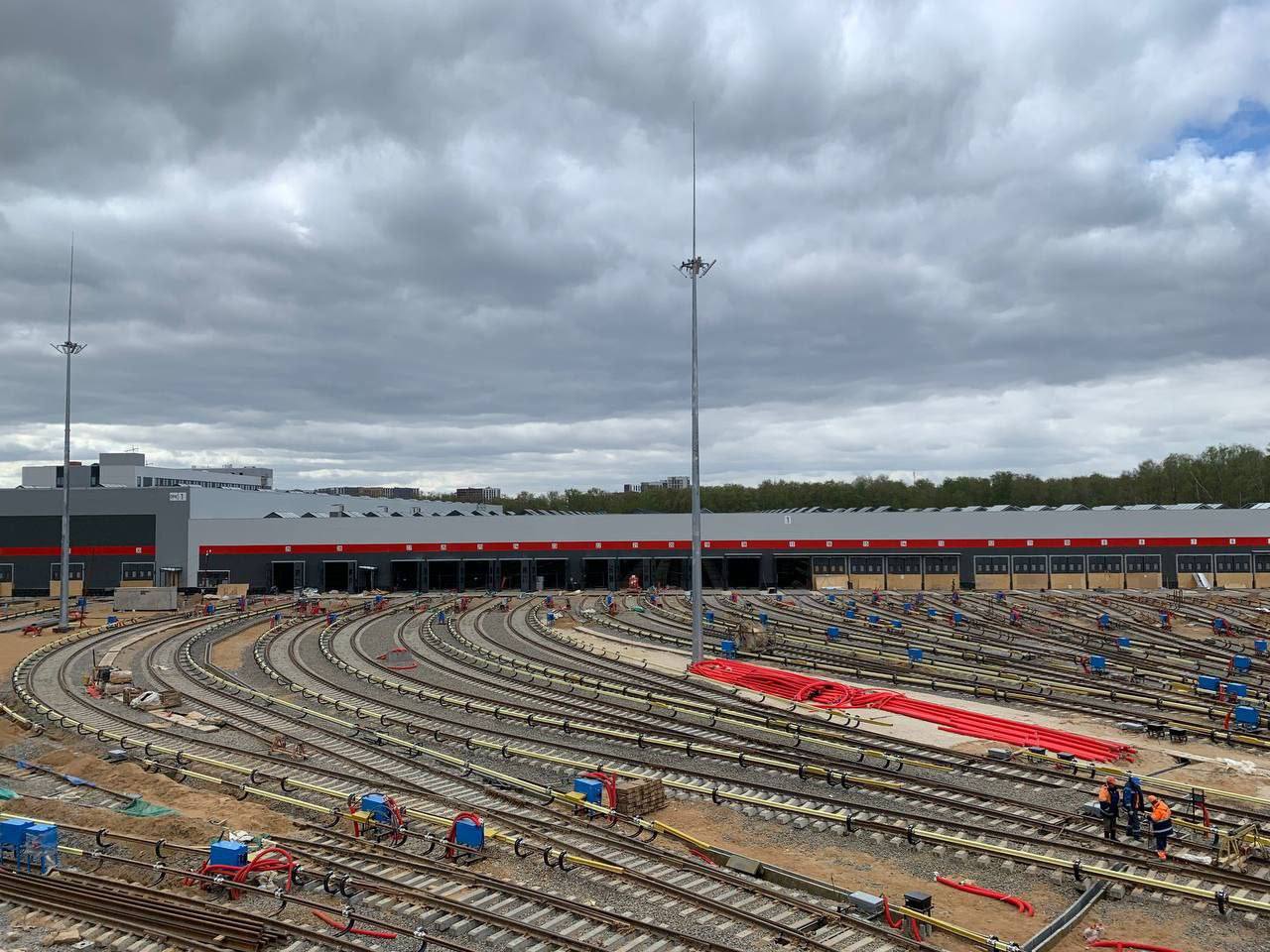 В конце мая строители смогли завершить остекление отстойно-ремонтного корпуса, а также работы по устройству верхнего строения пути и монтажу внутренних сэндвич-панелей, кровли, оклейки мембраной зенитных фонарей и устройство трубопроводов.