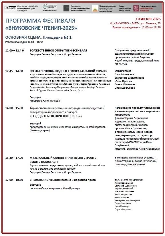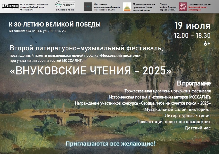 «Такое масштабное мероприятие мы проводим уже второй раз. Уверена, что наш яркий литературно-музыкальный фестиваль станет ежегодным знаковым событием, которое расширит литературно-художественное пространство Внукова, повысит интерес молодежи к истории района, а также привлечет внимание новых талантливых участников, гостей и культурных организаций округа».