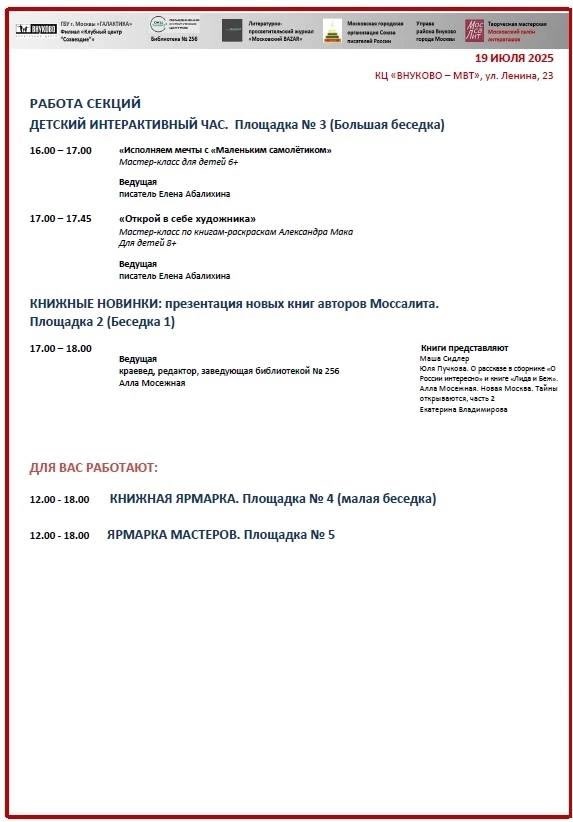 Время проведения с 12.00 до 18.30. Место проведения: КЦ «Внуково-МВТ», ул. Ленина, 23. Обширная программа фестиваля.