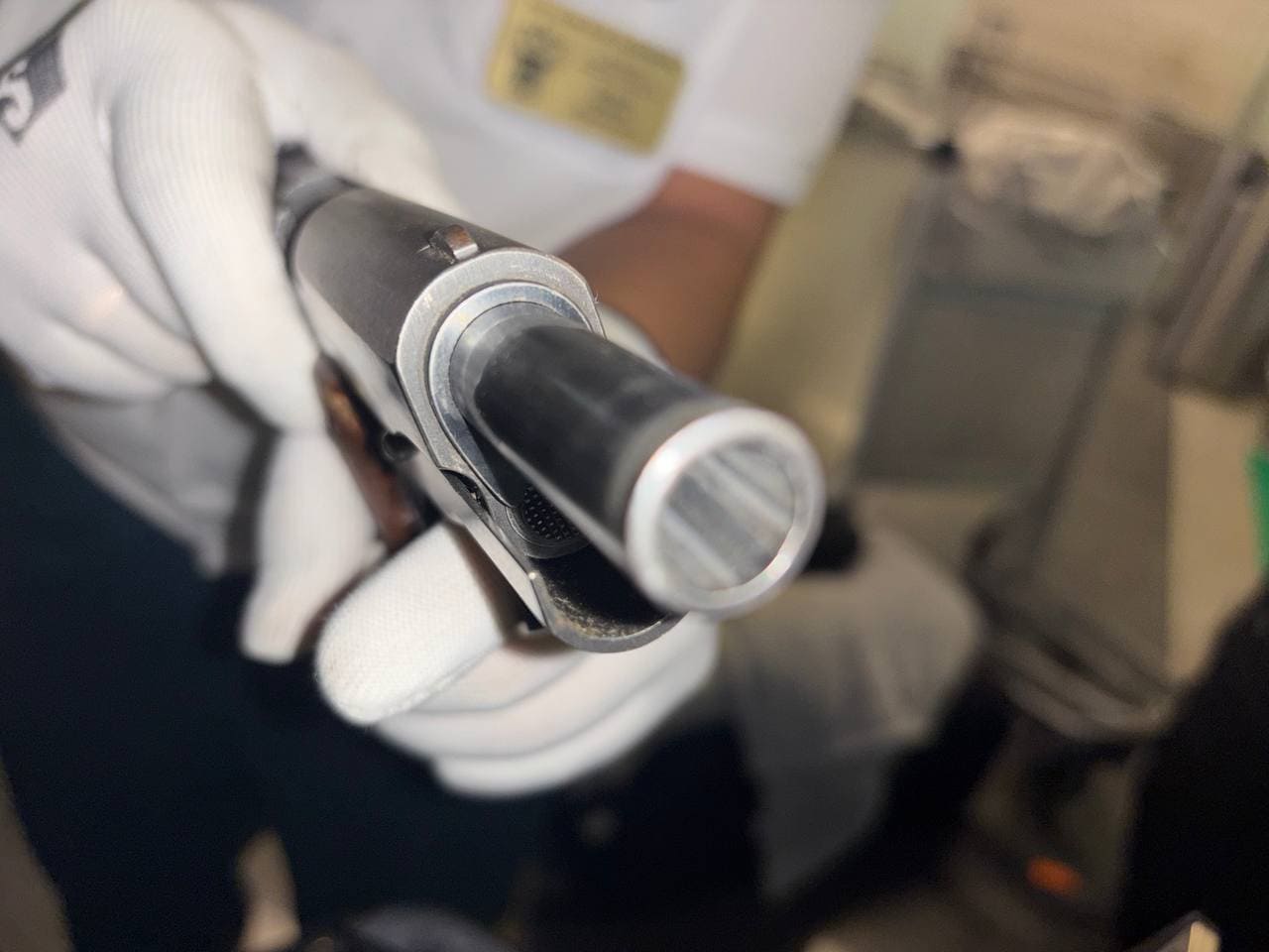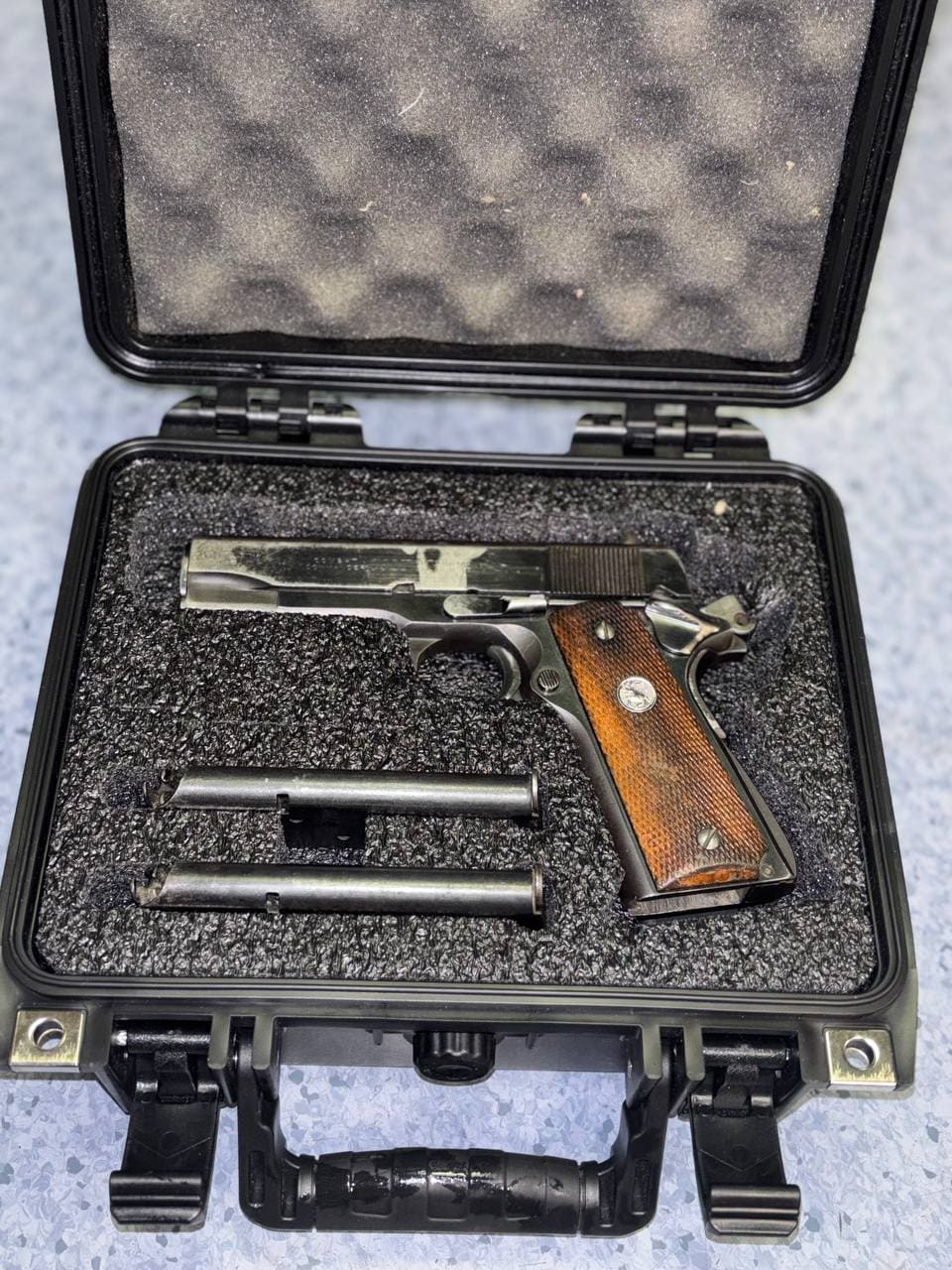 В чемодане они нашли настоящий боевой пистолет — американский Colt Combat Commander 45 калибра. К нему были ещё три пустые обоймы. А при личном досмотре женщина достала банковский чек на сумму 138 тысяч долларов!