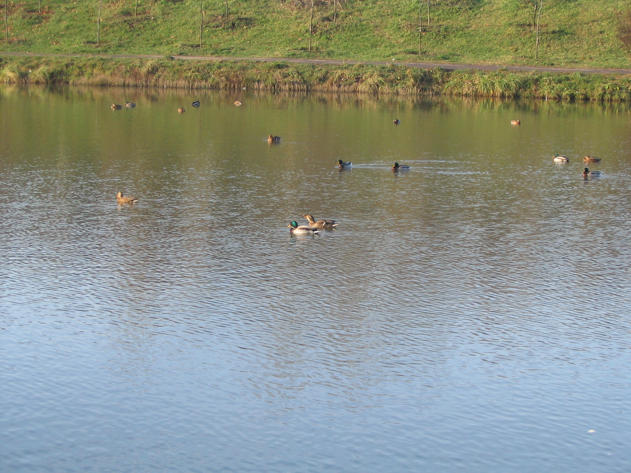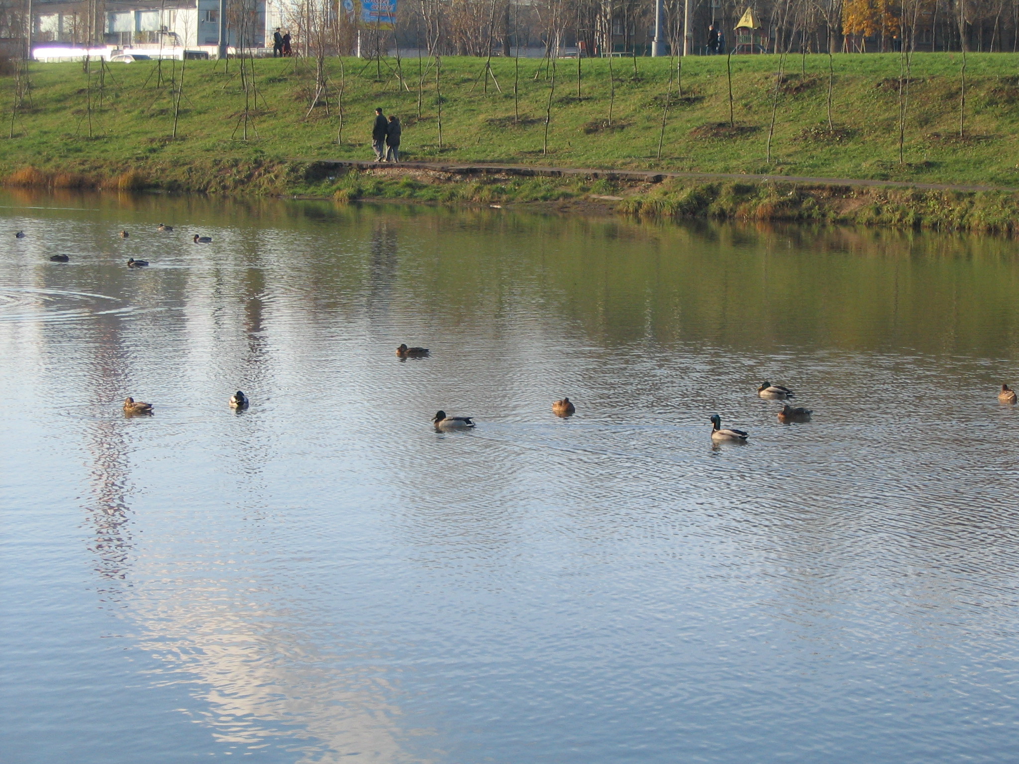Большой Солнцевский пруд без дома-корабля. Рыбак и почти никого благоустройства, только зеленуха и утки.
