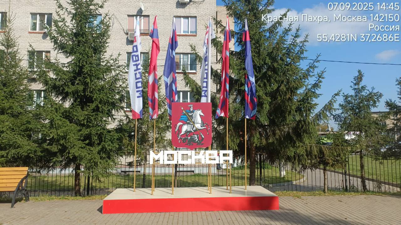 Коммунальщики (обычно они, из жилищника, или кто-то рядом) занимались украшением района Краснопахорский. После того, как флаги и герб были установлены в Парке Победы в Красной Пахре, местные жители заметили некоторые нестыковки.
