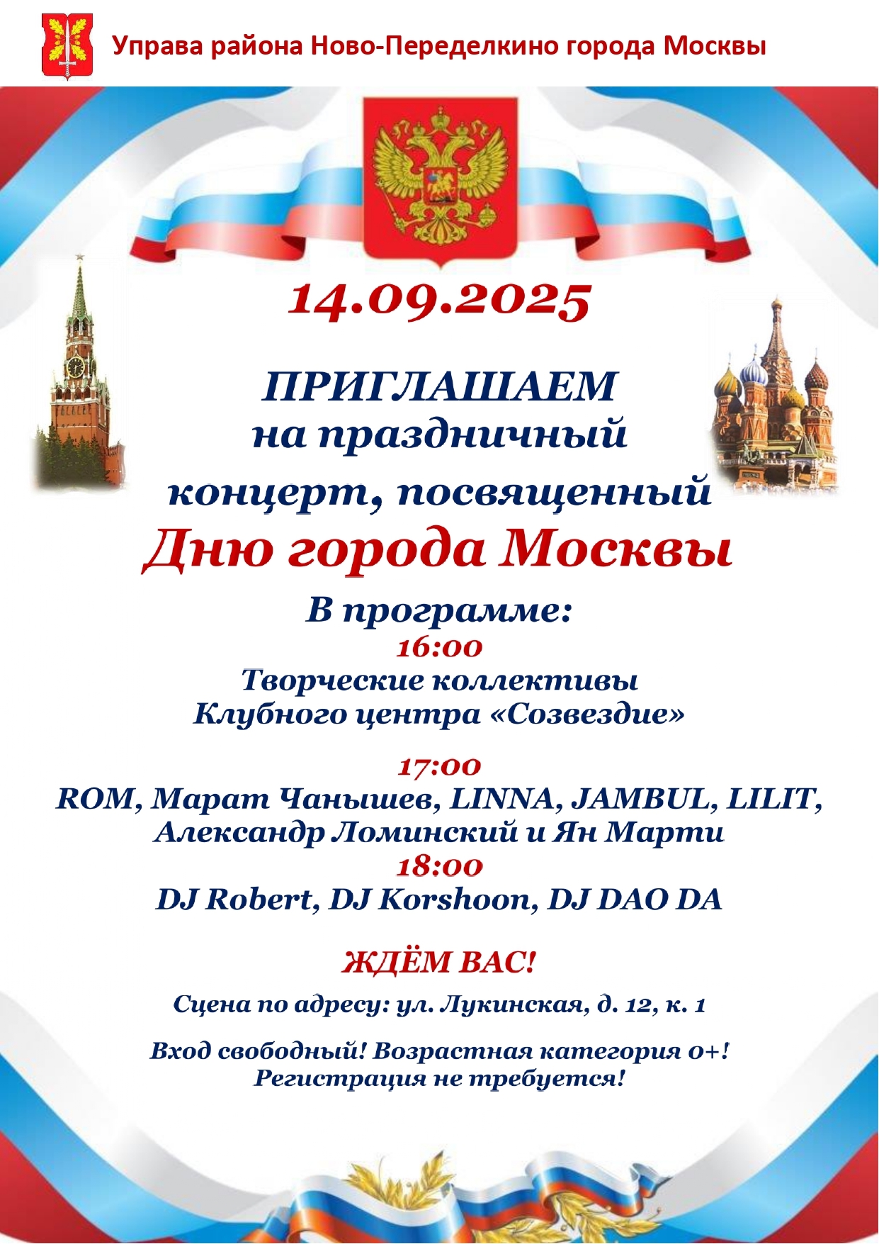 Управа района Ново-Переделкино опубликовала афишу празднования Дня города 2025 в районе, на сцене на Лукинской улице.