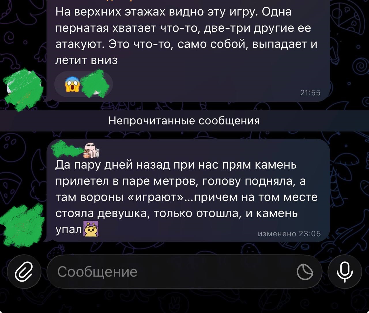 И тут общественность уже начала сходиться во мнении о том, что все дело в воронах. Более того, жители выяснили, что на крыше 3-го и 5-го домов насыпаны камни. А над головами летают "полчища" птиц.
