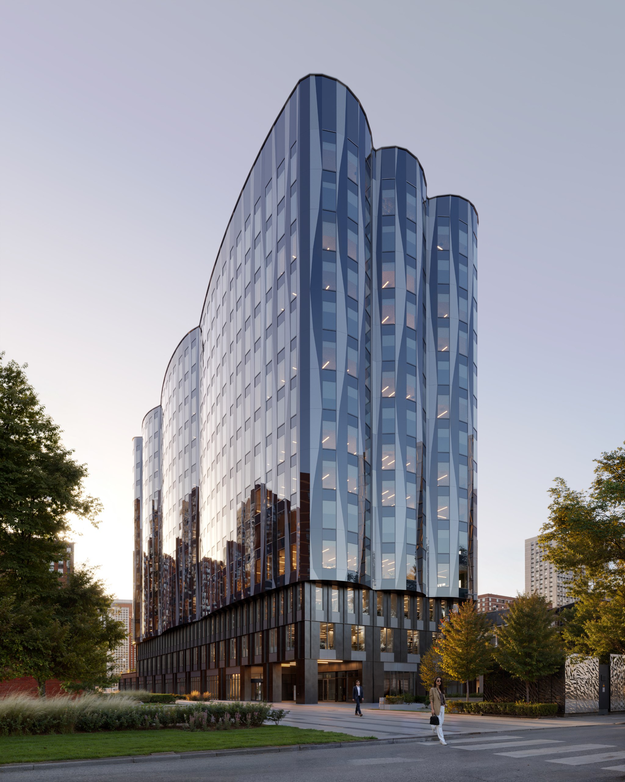 Проект разработало бюро PANACOM. Получилось так — волны, динамичные линии, мягкие формы, отражения создают ощущение движения воды и ветра. Трехэтажный стилобат выступает в роли визуальной «ватерлинии», поддерживая изящный силуэт башни.