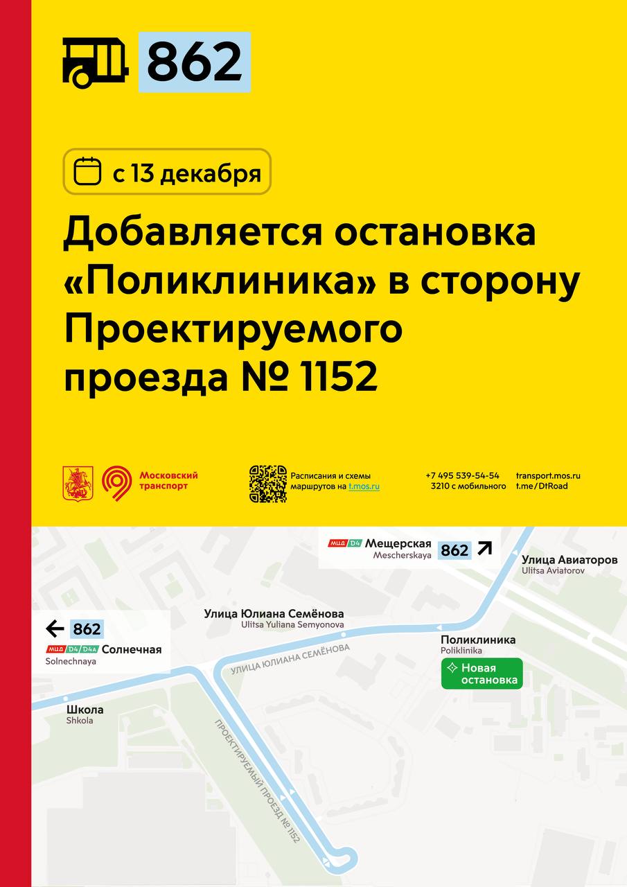 С 13 декабря добавляется остановка «Поликлиника» в строну Проектируемого проезда № 1152 для маршрута 862.