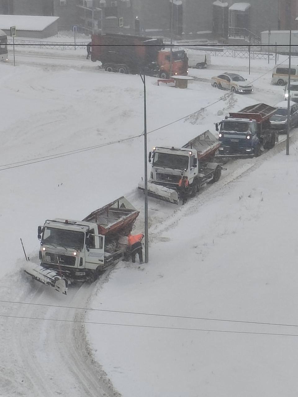 Обновление 21:34: На место приехал неведомый гусеничный агрегат и помог расчистить дорогу. Фото и видео показали Сергей и Екатерина.