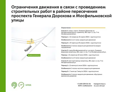 В период с 12 января до 10 июня 2026 г. будет недоступна для движения 1 полоса на участке съезда с проспекта Генерала Дорохова на Мосфильмовскую улицу, а также на участке съезда с Мосфильмовской улицы на проспект Генерала Дорохова. Это связано с проведением строительных работ.
